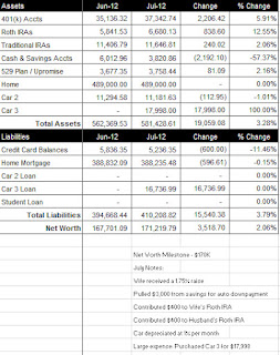 In June, our Net Worth increased $4,342.33, to a total of $167,701.09 (click on spreadsheet below). This puts us at 96.83% of our 2012 Net Worth goal of $173,200 (see NW meter on left side of page).