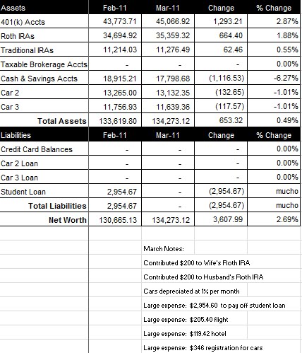 March was another solid month. Our net worth increased $3,607.99 from last month, to a total of $134,273.12 (click on spreadsheet below).